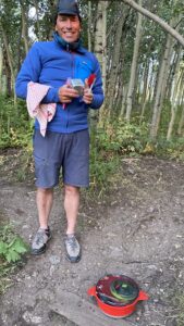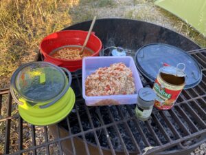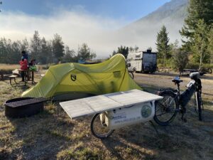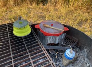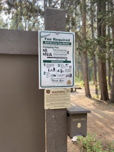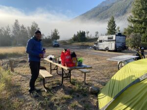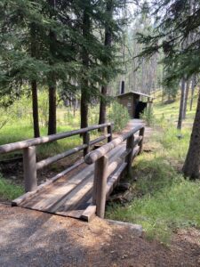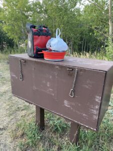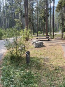 Nous nous installerons dans le dernier emplacement libre. Camping gratuit cette fois (en général max 20 dollars), first arrived, first served. Comme tous les campings du coin, il y a juste une toilette sèche (sans papiers toilettes…) et un accès à de l’eau potable (ici une source). Nous sommes à nouveau dans une région à ours, et présence d’une armoire anti-ours pour y déposer tous nos aliments.
