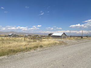 Changement de décor par rapport aux jours précédents, plus de sapins… Il a gelé cette nuit, il fait encore bien froid; le ciel est d’un bleu pur (plus de smoke). Nous longeons un premier lac, artificiel, en fait un énorme réservoir et poursuivons la piste en gravier toute la journée, dans un vallée magnifique; tout est étourdissant et grandiose; seuls quelques ranchs semblent avoir été déposés là, et quelques milliers de vaches (j’oublie, un motard et un cycliste). Décor de far-west, nous nous attendions presque à voir apparaitre Charles Ingalls sortant de son chariot et Mary nous apportant des gaufres qu’elle avait préparées avec amour pour nous.