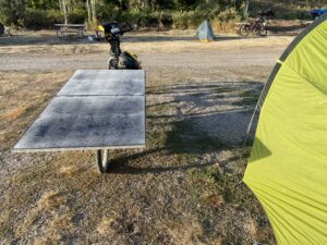 Bertrand déplie la tente, et je l’aide à finaliser cette opération; nous lançons la cuisine. Nous effectuons aussi un petit tour des vélos; avec les secousses, il n’est pas rare que des parties se desserrent. Heureusement, nous avions choisi un système de transmission parfaitement adapté (pour les amateurs, un changement de vitesse Pinion 18 vitesses (concurrent du Rohloff), ç-à-d que les vitesses sont dans un bain d’huile, et une courroie remplace la chaîne). Nous n’avons donc ni chaîne, ni cassette de vélo classique, dont nous voyons tous les jours les autres cyclistes faire une inspection minutieuse et qui souffrent de ces conditions.