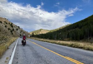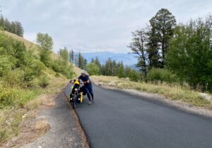 Pour sortir du Wyoming et pour entrer dans l’Idaho, nous devons franchir la Teton Pass. Une superbe piste cyclable, toute neuve, nous y attend ! En principe les e-bikes ne sont pas autorisés (nous faisons semblant de ne pas comprendre…), nous la choisissons, seule alternative crédible à la highway sinueuse. Le pente est vraiment raide. Elle nous mène de 2.000 à 2.700 mètres en à peine 4,5 miles. L’altimètre indique des passages où la pente est supérieure à 12%.