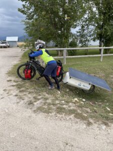 Nous pédalons dans nos plus petites vitesses, et poussons l’assistance électrique; malgré cette aide, l’altitude et le froid, nous sommes en nage. Et nos moteurs chauffent; un trop plein d’énergie est injecté, et la lenteur (3 à 4 km/h) stocke l’énergie et l’empêche de sortir (un certain « effet bobine »). La température des moteurs monte à 89, 92…, 100, finalement 110 °. Nous devons nous arrêter régulièrement pour les refroidir. Nos coeurs aussi s’emballent. Nous mettrons presque deux heures à franchir ce col, le plus haut et raide que nous ayons eu jusqu’à présent.