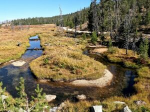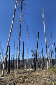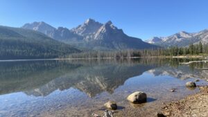 Ce sera notamment le cas dans la petite ville de Stanley. 63 habitants comptabilisés, et pourtant plusieurs hôtels. Nous finirons par trouver la toute dernière chambre libre dans cette station qui semble si huppée, au milieu de nulle part. Il est vrai que les hots springs se succèdent, les lacs sont de vrais miroirs à l’eau transparente. La nuit est pluvieuse et même orageuse et le matin très froid; de la glace s’est accumulée sur les panneaux. Nous sommes bien contents d’avoir opté par une chambre, et d’avoir remisé la tente cette nuit-là. La grisaille, et un mal de dos (Bertrand), nous incitent à faire un stop d’un jour à cet endroit-là; nous aurions souhaité le prolonger, impossible, plus de possibilité de logement. Et nous reprenons donc finalement la route, une autre scenic byway. Nous longeons la rivière Payette pendant des dizaines de miles, et retrouvons les pins. Nous revoyons aussi les conséquences des incendies passés, et prenons la mesure du nombre de forêts calcinées.