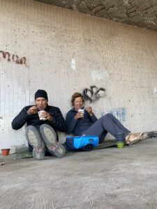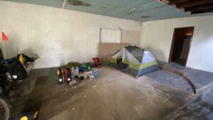 Quand nous ne trouvons pas d’hôtels, nous logerons ici dans une maison abandonnée, là dans une annexe d’une ancienne pompe à essence (aussi abandonnée). A chaque fois, nous établissons un contact avec quelqu’un, histoire de bien montrer que nous sommes là, « autorisés » par un local ; et de nous sentir plus en sécurité. Nous avons rejeté l’idée de planter notre tente près de la route.
