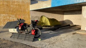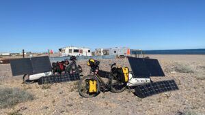 Toutefois, nous restons encore prudents ; nous mettons nos cadenas tous les soirs sur les vélos et remorques. En journée, au moins l’un de nous reste en permanence près d’eux, par exemple lorsque l’autre fait des achats dans un mercado ou autre commerce de détail. Nos engins attirent encore l’attention, moins qu’en Amérique du Nord. Nous n’avons quasiment plus de question sur le solaire; sans doute qu’à la fois ces engins impressionnent, et qu’il y a la barrière de la langue.