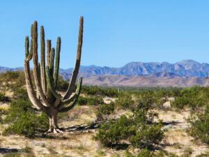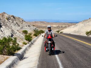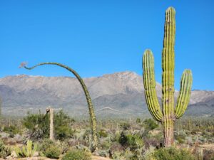 L’aridité de la chaîne de montagne, et sa typologie géologique, ont remplacé les plages du littoral californien. Le système routier rend la traversée de la Baja assez simple. Après Tecate, direction Ensenada ou la côte pacifique ; puis rentrée dans le massif montagneux que nous traversons une première fois vers la Mer de Cortès. Nous prenons ensuite la « 5 » pour quitter la Mer de Cortès, retraverser le plateau montagneux, et re-descendre vers le pacifique par la « 1 ». Et ainsi de suite, un jeu de yoyo jusqu’en bas. Je résume cela autrement. Avant-hier soir : poisson (Pacifique) ; hier soir : poulet (montagne) ; ce soir, poisson (mer de Cortès) ; demain soir : poulet (montagne), etc…