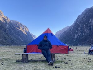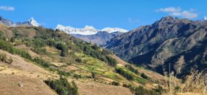 Un peu sans doute à la façon d’alpinistes (que nous côtoyons en grand nombre dans ce coin du Pérou), nous décidons de rentrer dans le parc par étape. Une première étape nous fait grimper un dénivelé de 2200 mètres, jusqu’à l’entrée officielle du parc, où nous décidons de planter notre tente. Le Huascaran (sommet le plus haut du Pérou, qui culmine à 6768 m) nous domine toute la journée. Notre tente est montée dans le jardin de la gargote en face de la maison du gardien du parc. La vie est rude, la maman était encore occupée à plumer un poulet dans la nuit tombante, et se lève à 4h du matin afin de préparer la journée; cela consiste à ranimer les multiples feux de bois qui lui serve de cuissons (selon les besoins) dans ses quelques mètres carrés noircis par la fumée. Il faut que tout soit prêt lorsque se présenteront les premiers visiteurs du parc. Sa nièce, à peine âgée de 11 ans, l’aide et se charge de la petite tienda le long de la route. Les hommes sont … absents; ou plus exactement sont là et regardent, sans bouger, toute l’agitation des femmes.