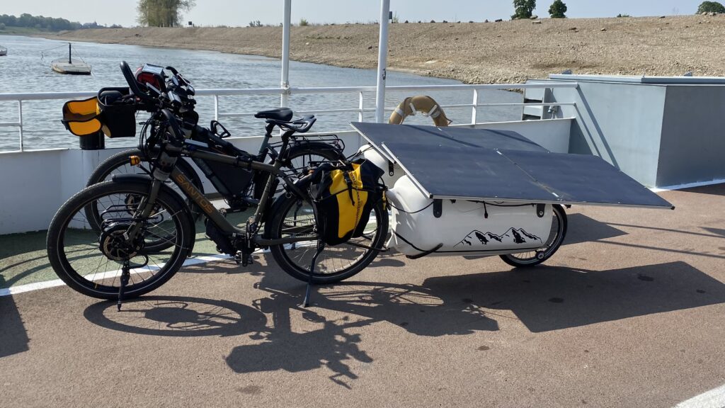 Grâce à l’aide de Guillaume Devot de Declic-Eco, les vélos ont été électrifiés par la pose d’un moteur dans la roue avant. Notre but est d’être le plus autonome possible et de ne pas être en quête permanente d’une recharge électrique conventionnelle. Pour ce faire, les vélos sont équipés de panneaux solaires (2 x 115 Wc), posés sur une remorque, afin de pouvoir recharger nos batteries (1150W) tout en roulant. Nous avons eu la chance de trouver des remorques TZC en carbone qui avaient déjà vécues de grandes aventures grâce à Jean-Marc et Paul.